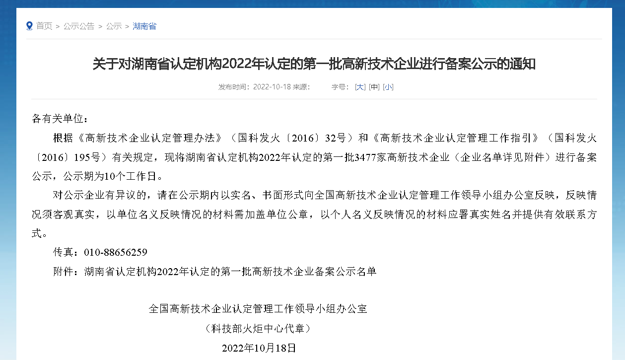 發(fā)表時(shí)間:2023-03-22 16:18 作者:handler 閱讀數(shù):2172終于等到了!科技部火炬中心官網(wǎng)發(fā)布了《關(guān)于湖南省2022年第一批備案高新技術(shù)企業(yè)名單的公告》